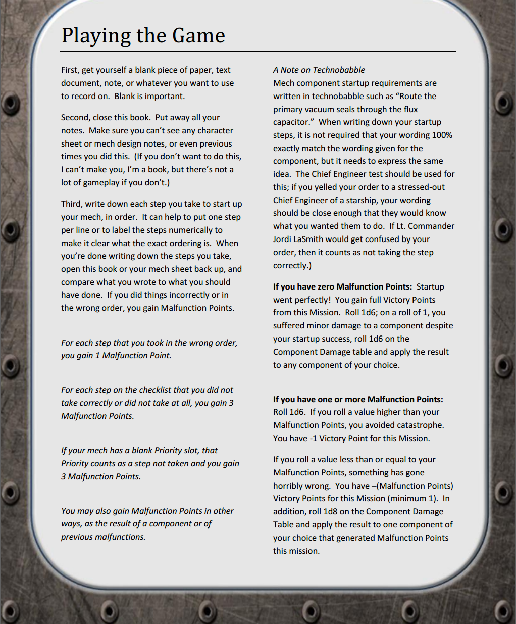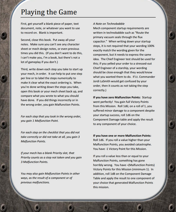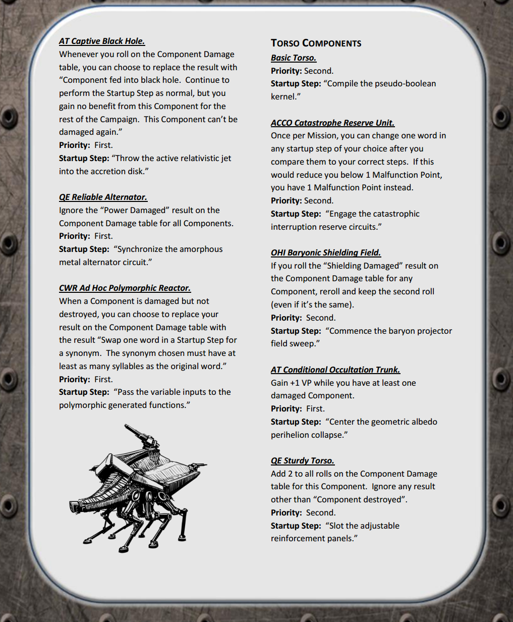 In order to take your startup steps, our core mechanic is technobabble. You must accurately reproduce a technobabble phrase for each of your components, in an order determined by the priority of your startup steps. Our example above is real gameplay; these are actual game mechanics you must successfully reproduce to correctly start up your mech. And you'll have to do it without any notes or assistance, unless you select components that let you!